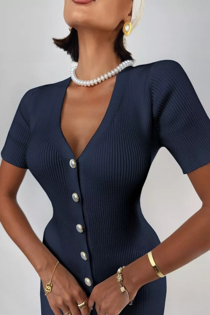 Waist Cinched V Neck Single Breasted Short Sleeve Knit Maxi Sweater Dress