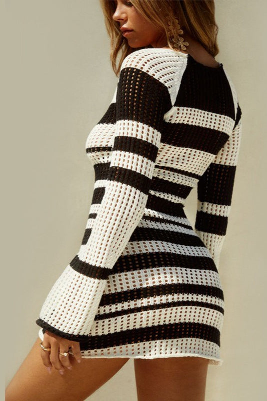 Striped Color-Block U-Neck Sexy Long-Sleeve Knit Sweater Dress