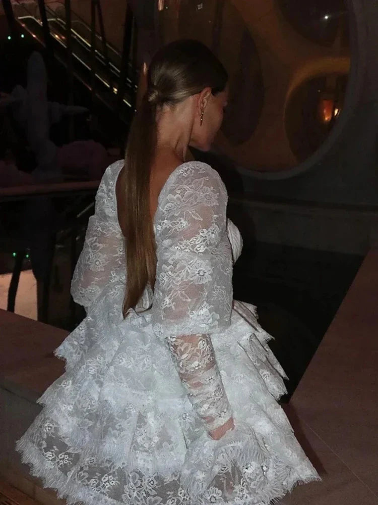 Puff Sleeve Layered Ruffle High Waist Lace Dress