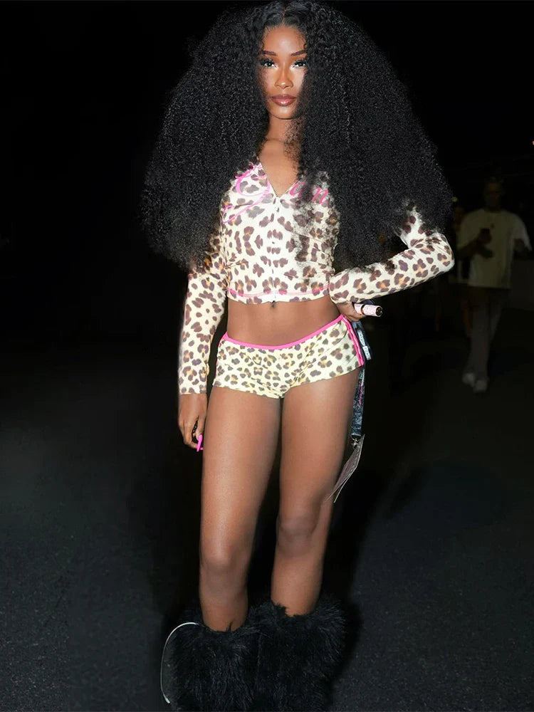Leopard Print Hooded Jacket Tracksuit Two Piece Shorts Set