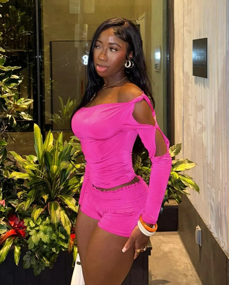 Slash Neck Hollow Long Sleeve Crop Top Two Piece Shorts Set