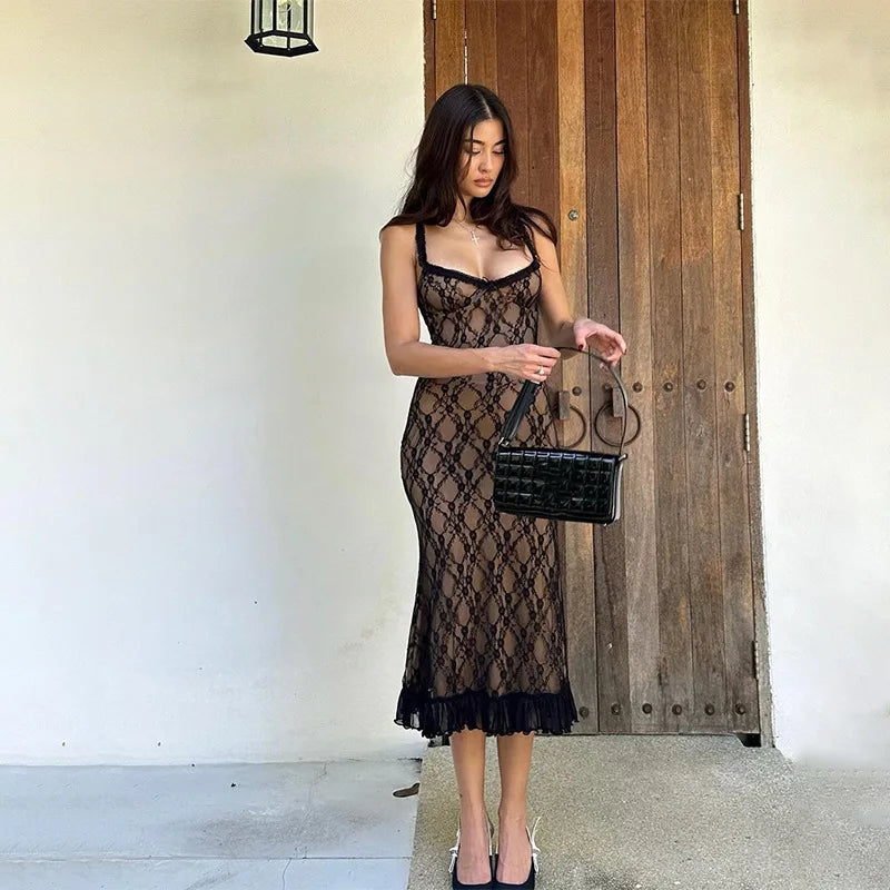 Mesh Lace Plunge Neck Midi Dress