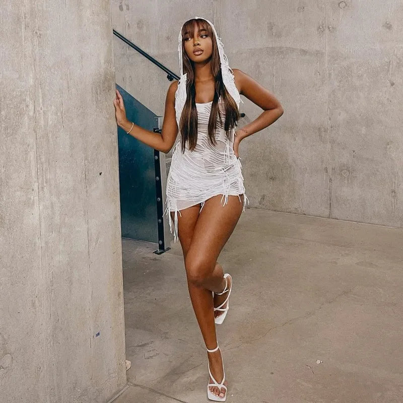 Tassel Hooded Slim Solid Mini Dress