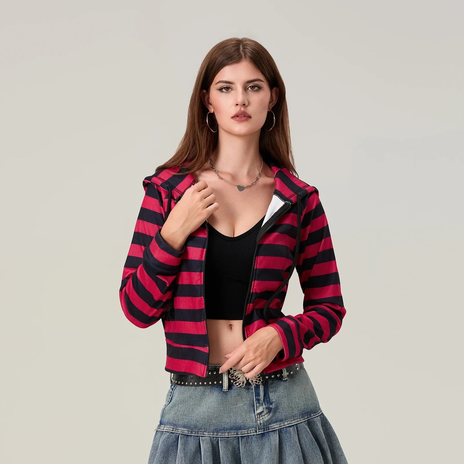 Striped Contrast Zip Cropped Hoodie