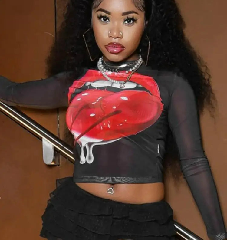 3D Print Mesh O-Neck Long Sleeve Sheer Top