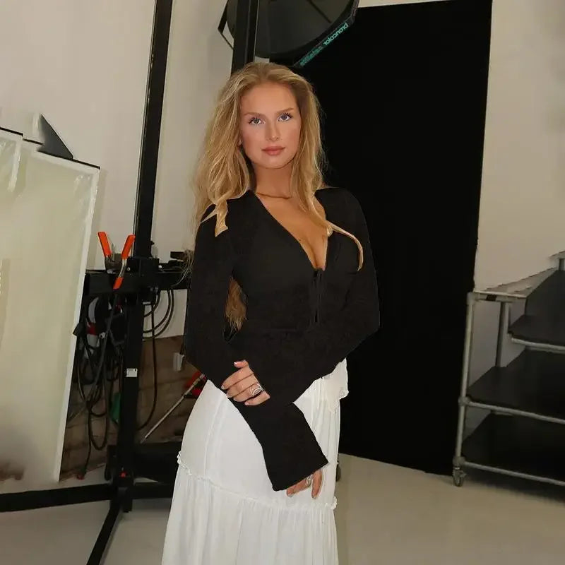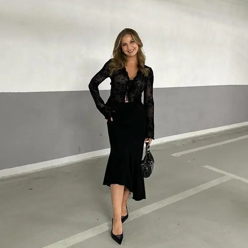 Chiffon Slim Fit Tweed Style Flare Sleeve Blouse