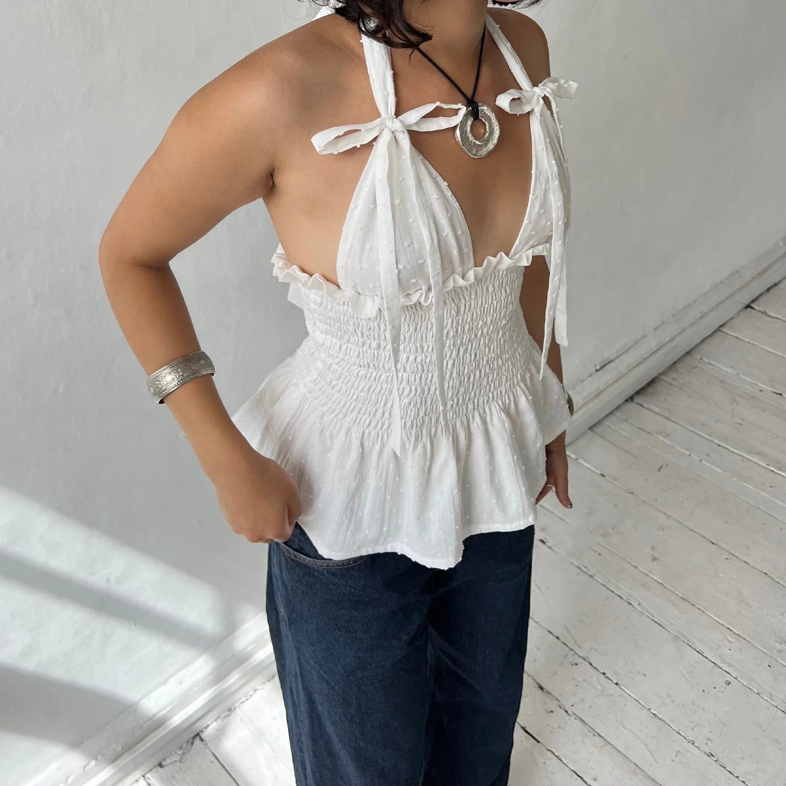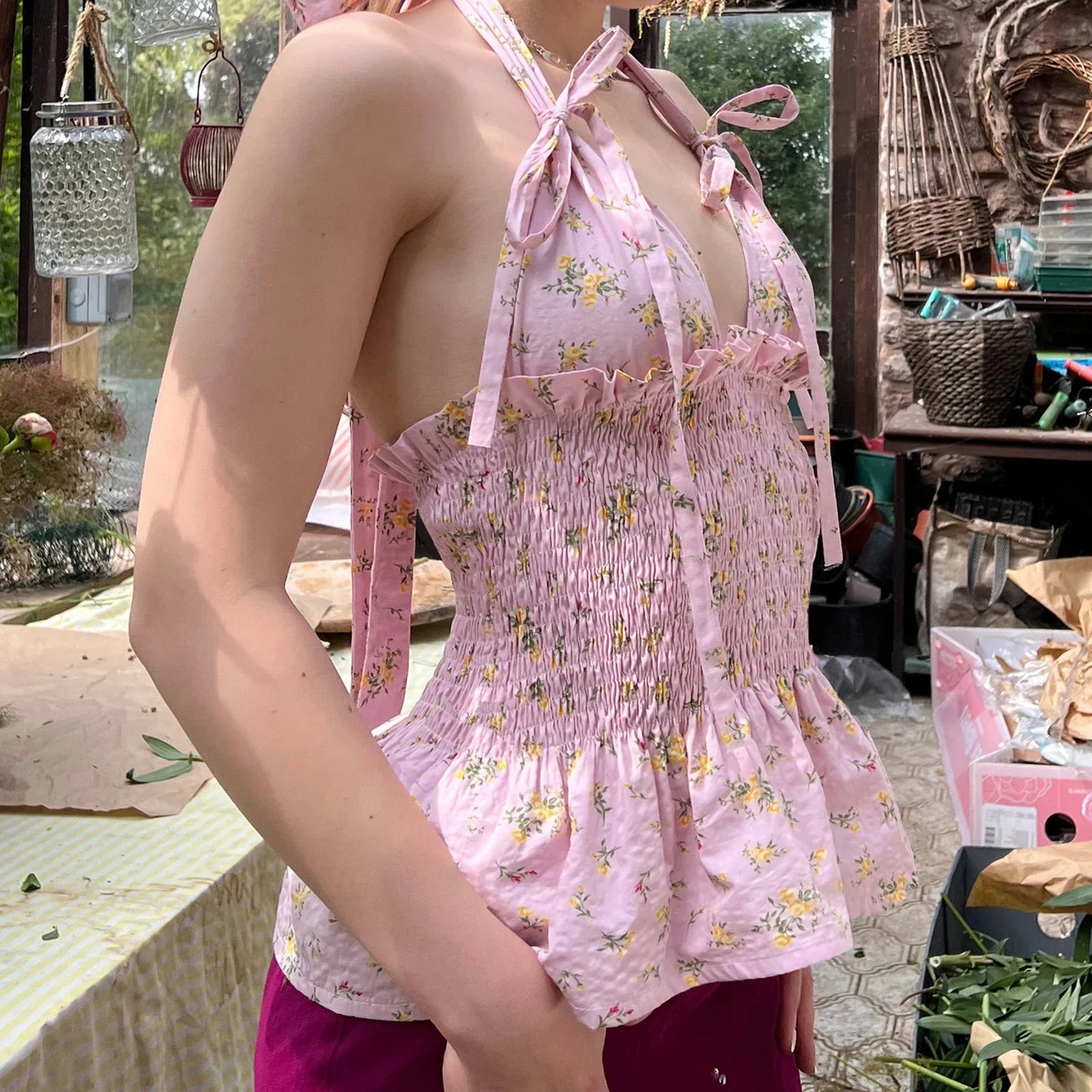 Y2K Floral Print Ruffled Hem Tie-Up Cami Top