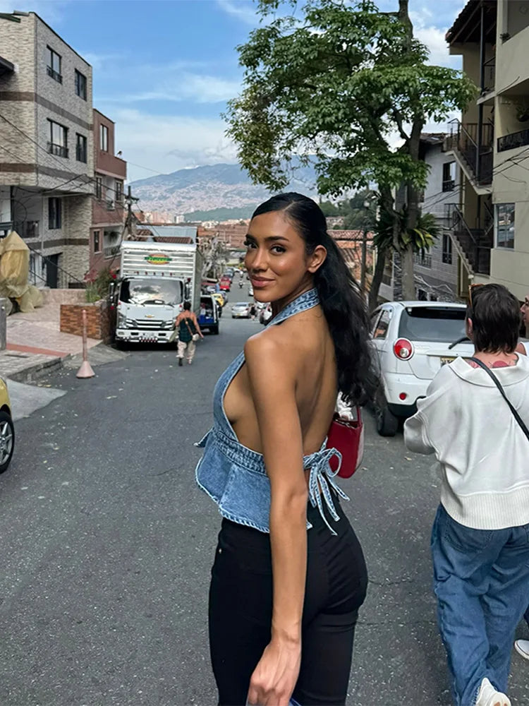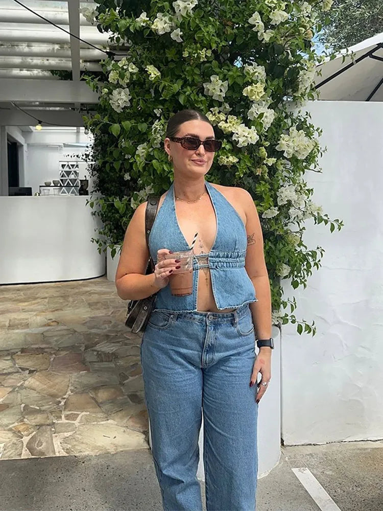 Denim Deep V-neck Backless Halter Lace-up Cami Top