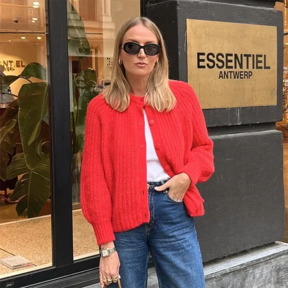 Red Christmas Sweater - Short Cardigan with Round Neck and Long Sleeves