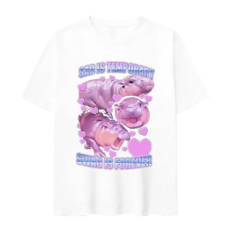 Retro Fashion Cute Baby Hippo Funny Meme Oversized Cotton Men Women T-Shirt Moo Deng