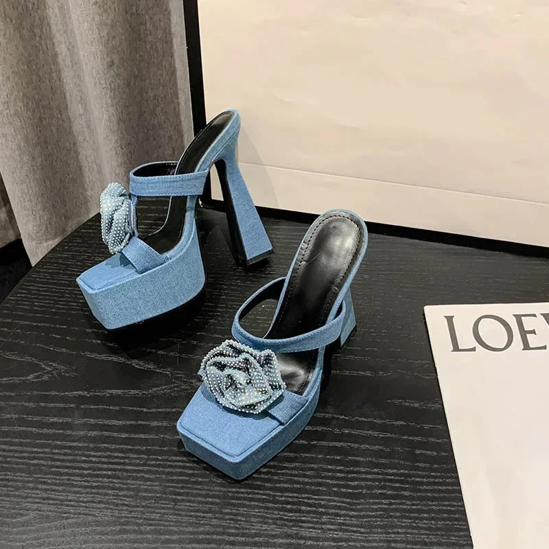 Fashionable 2024 Denim Blue Rhinestone Rose Flower Peep Toe Gladiator High Heel