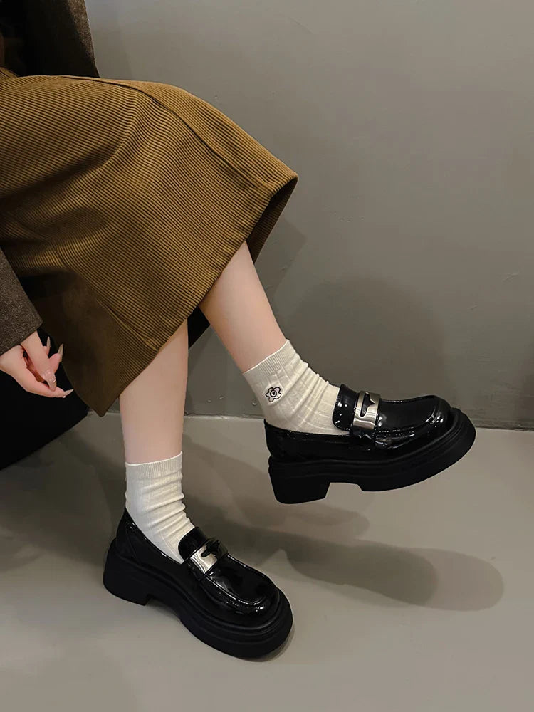 Fur Round Toe British Style Black Platform Casual Leather Sneaker Loafers