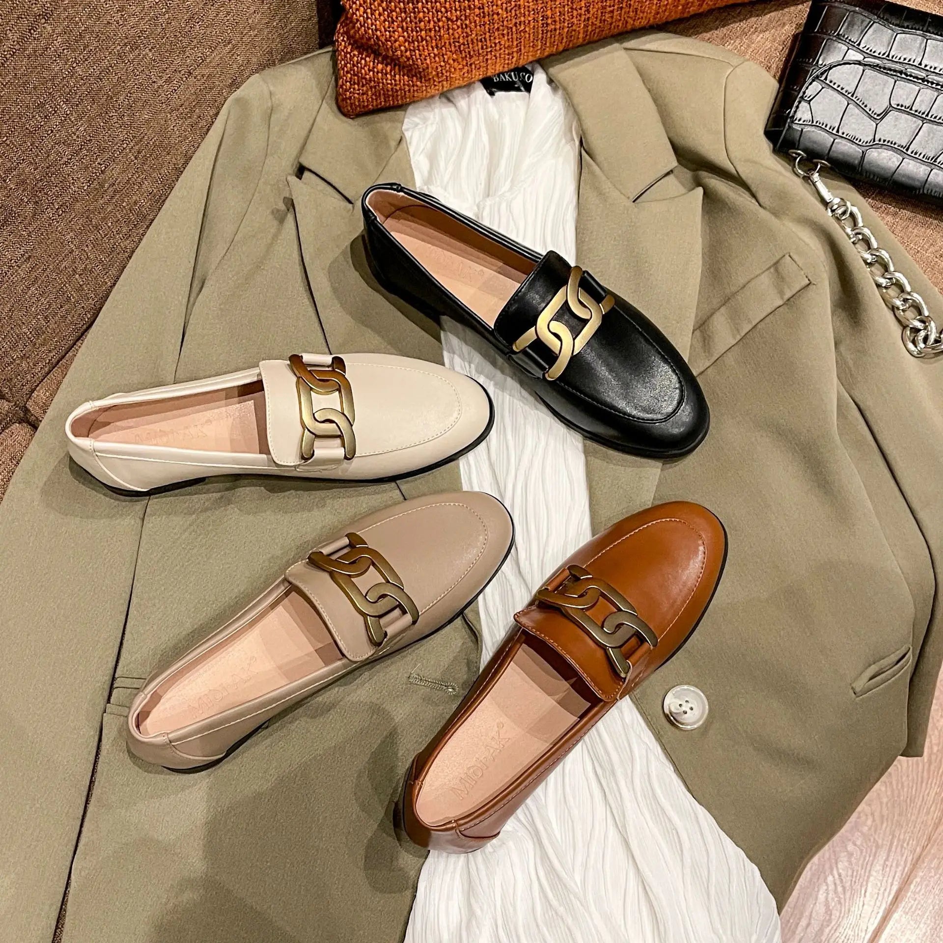 Metal Chain Plush Leather Round Toe Plus Size Autumn Winter Moccasins Loafers