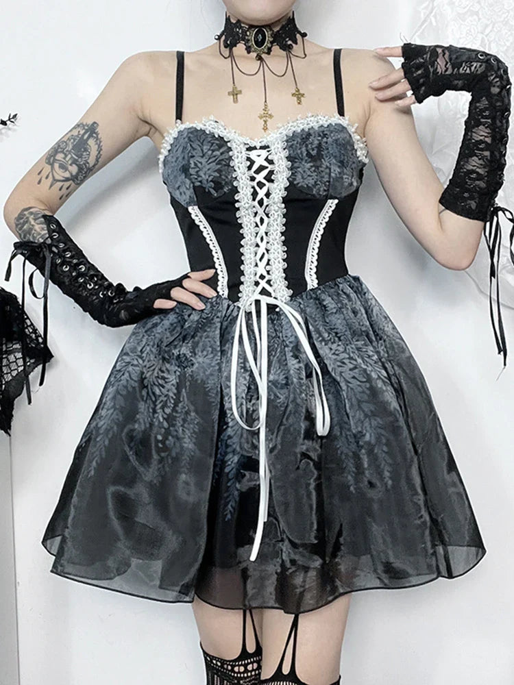 Gothic Spliced Printed Suspender Corset A Line Vintage Sexy Kawaii Mini Dress