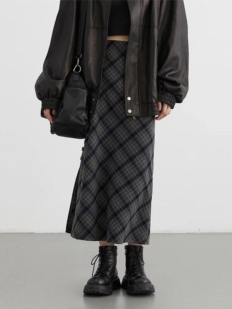 Long Casual Sweet Cool Style High Waist Slit Plaid Tube Skirt