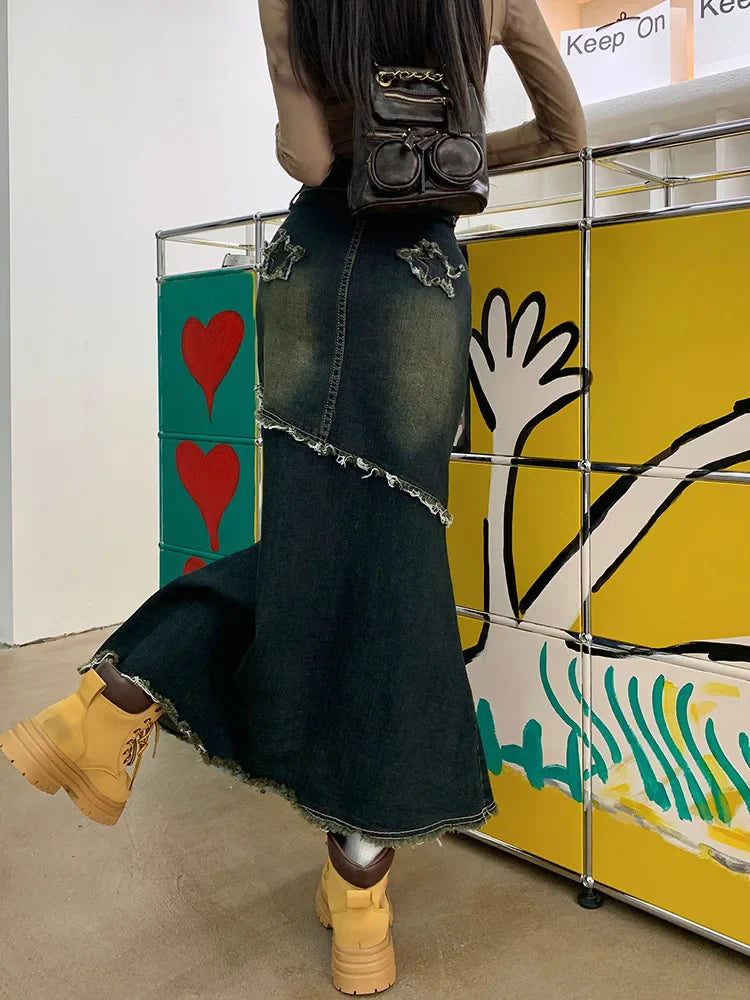 DressBetty - High Waist Raw Trim Mermaid Hem Long Denim Skirt