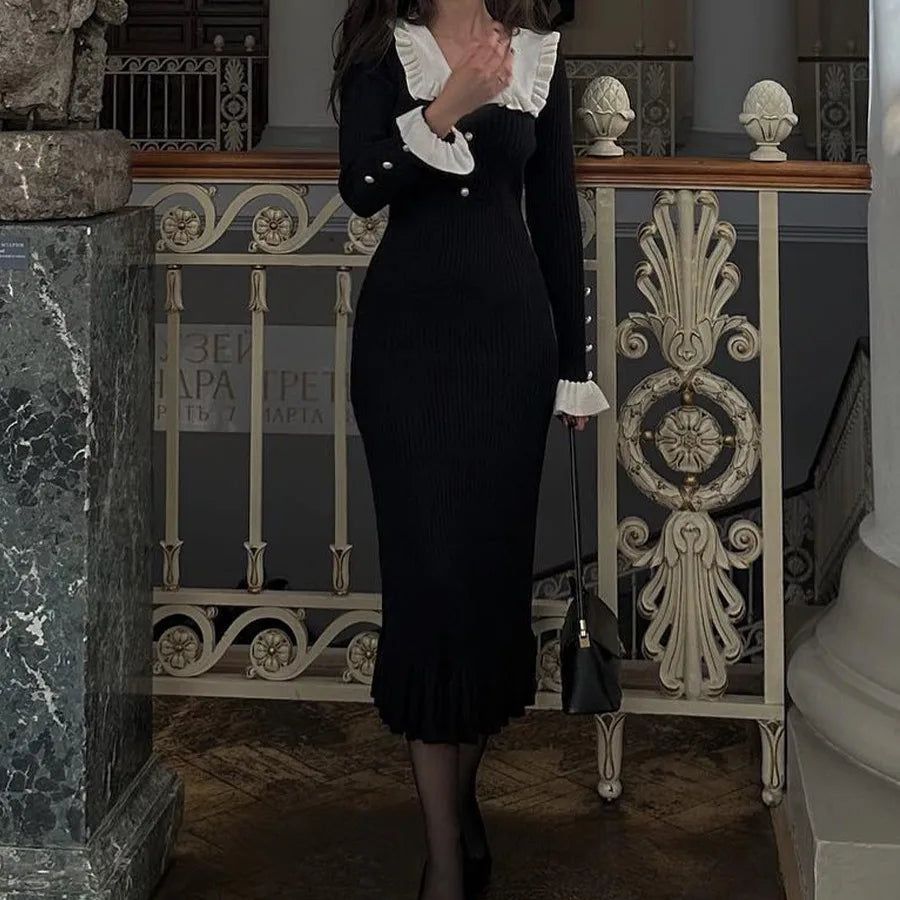 Ruffled Long-sleeved Vintage High-waisted French Creamy White Midi Dresses