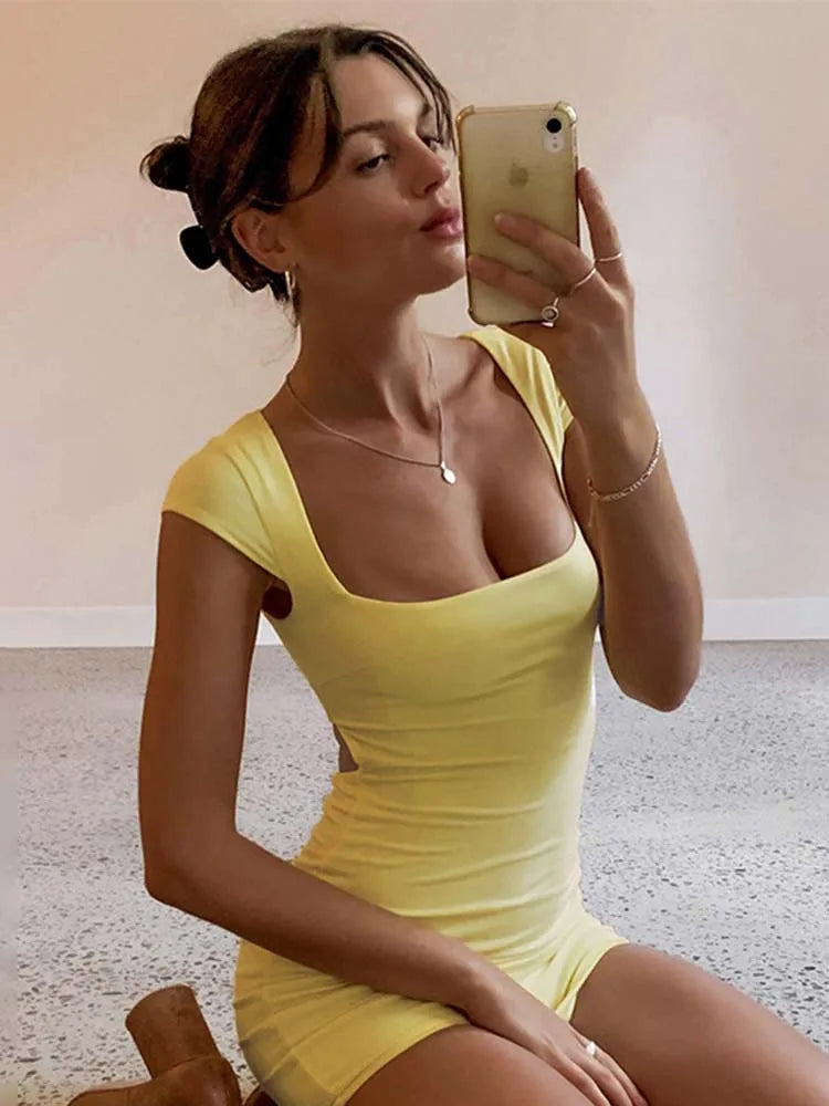 Square Neck Summer Black Short Sleeve Cut Out Elegant Mini Clubwear Midi Dresses