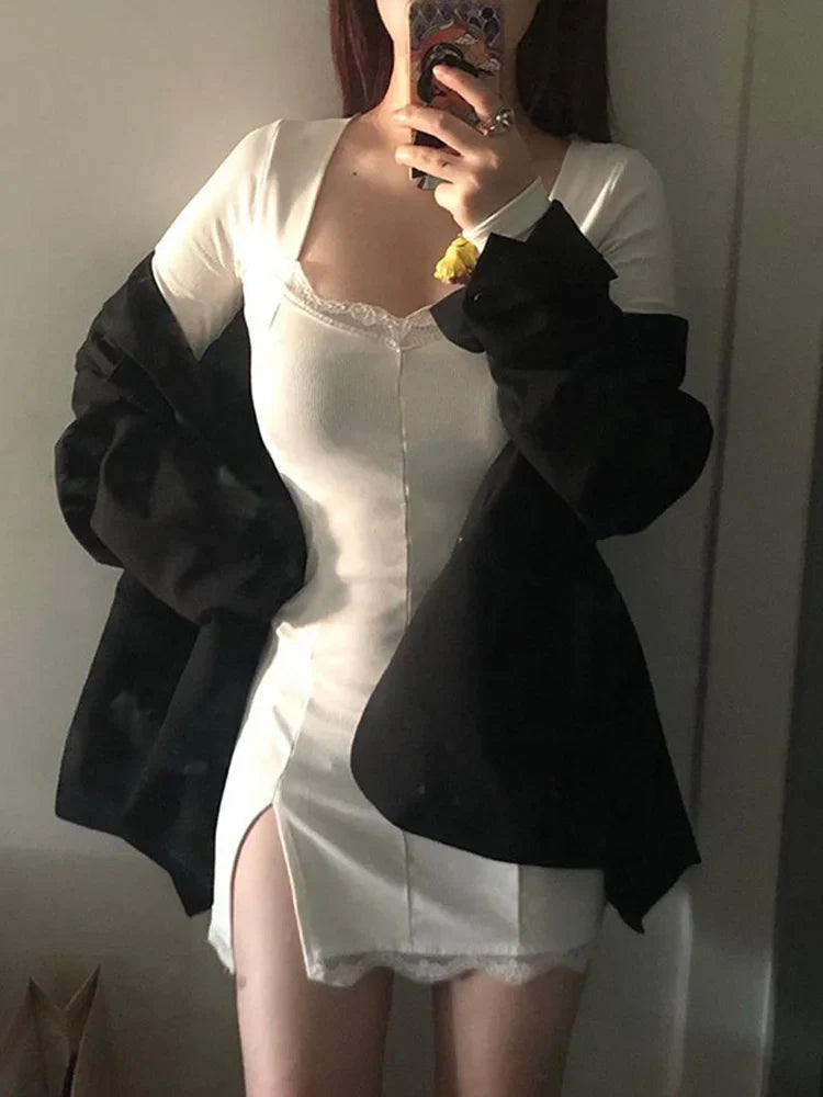 Autumn Spring Women Sexy Lace Patchwork Split Mini Low Midi Dresses