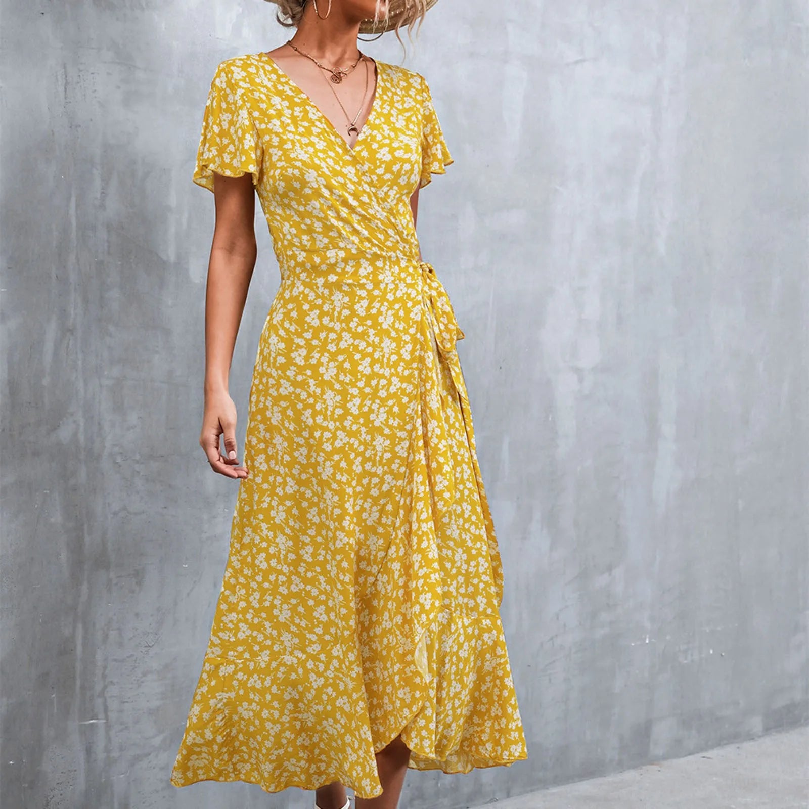 Chic Summer V Neck Short Sleeve Split Wrap Floral Maxi Waist Tie Casual Flowy Long Boho Beach Femme Robe Dress