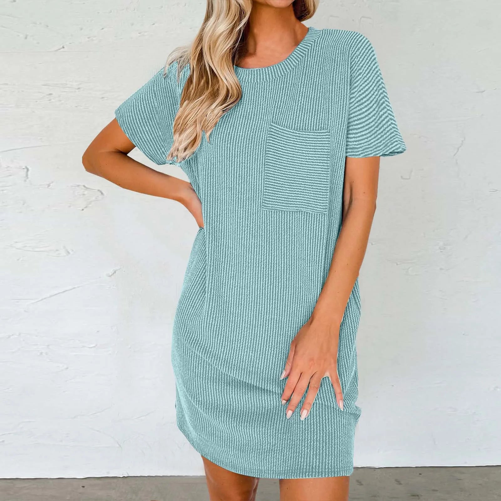 Spring Summer T Shirt Solid Color Round Neck Short Sleeved Casual Pocket Loose Striped Printed Dress