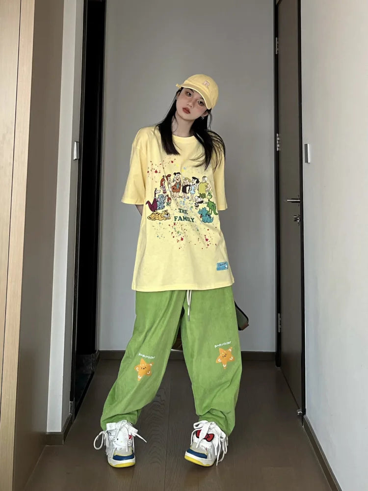 Vintage Hippie Star Print Corduroy Kawaii Green Wide Leg Sweatpants Pant