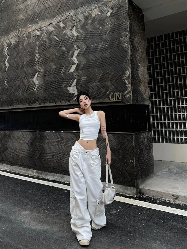 Y2K Vintage White Cargo Korean Style Wide Leg Denim Oversized Streetwear Pant