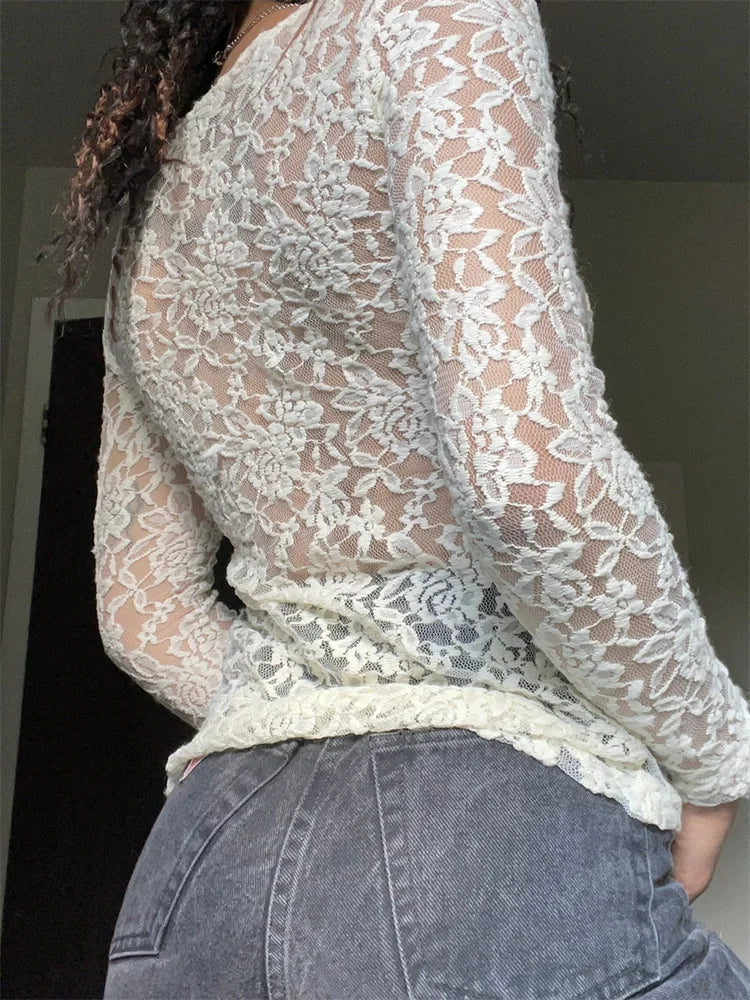 Women Fairy Grunge Vintage Kawaii Lace Mesh See Through White 2024 T-shirts