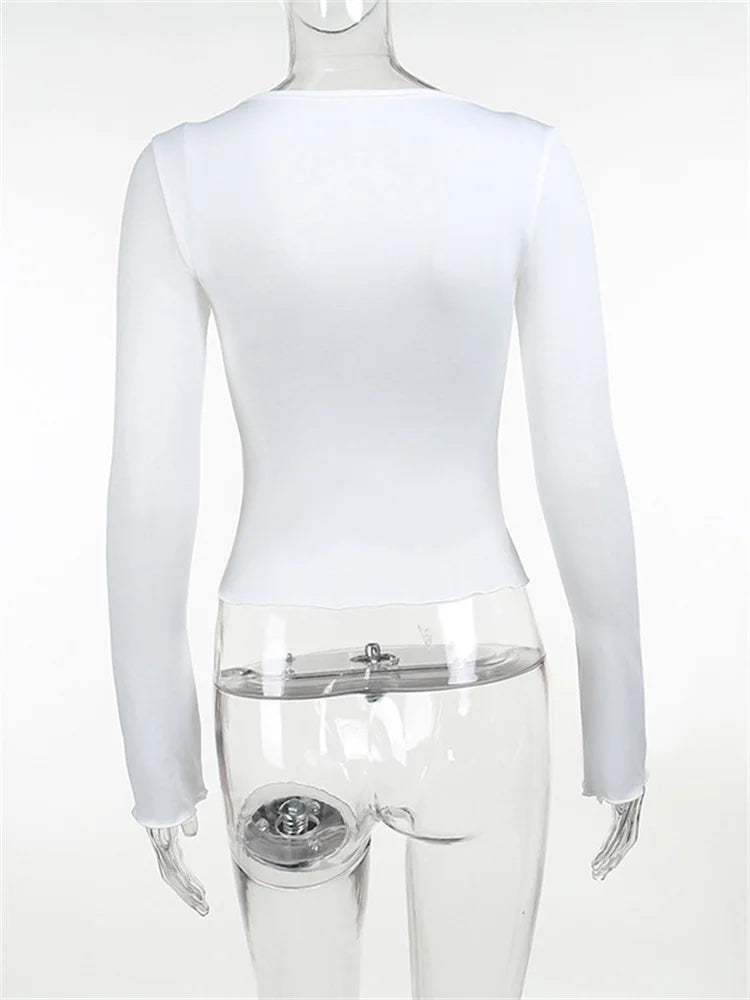 Long Sleeve Deep V-neck Criss-Cross Tie-Up Solid Spring Fall Slim Fit T-shirts