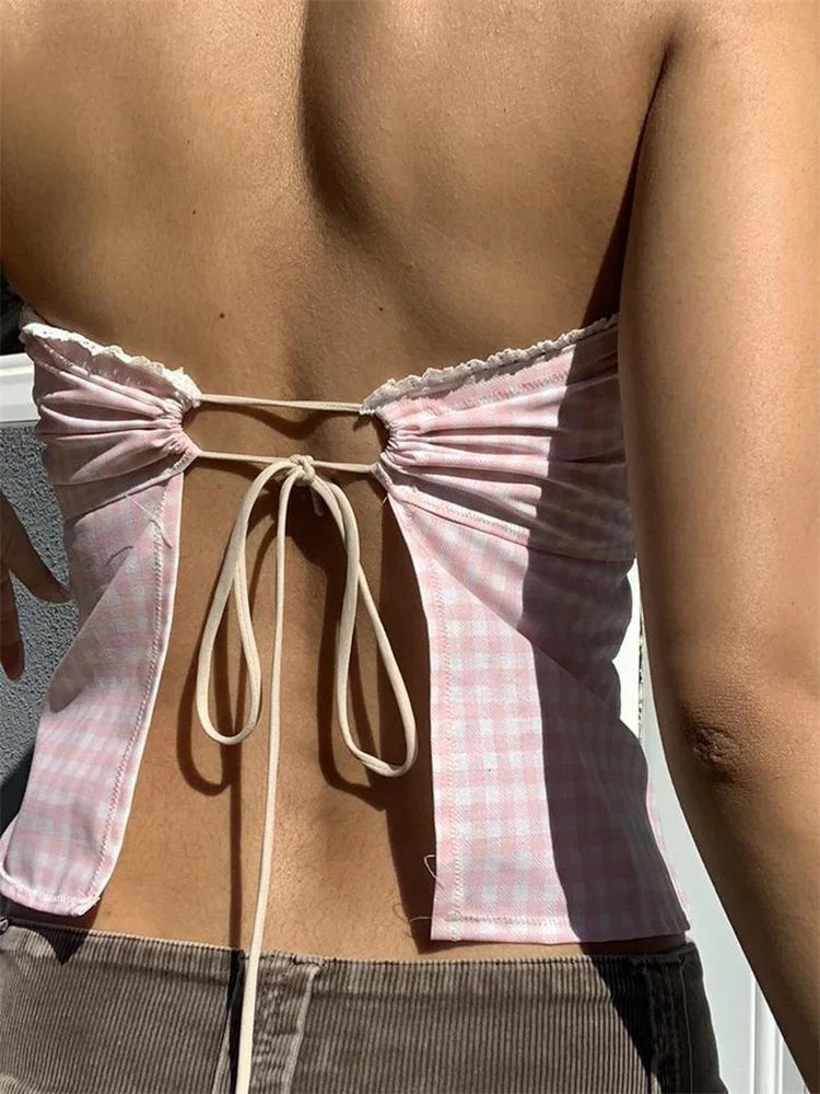 Retro Strapless Off Shoulder Tube Lace Patchwork Summer Plaid Floral Print Aesthetic Backless Crop Top