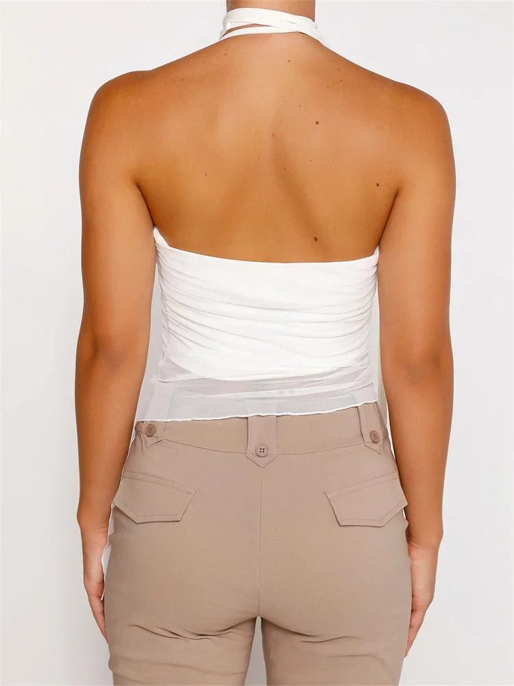 Mesh See Through Y2K Clubwear Sexy Women Halter Criss-cross Tie-up Off Shoulder Cutout Irregular Hem Vest Crop Top